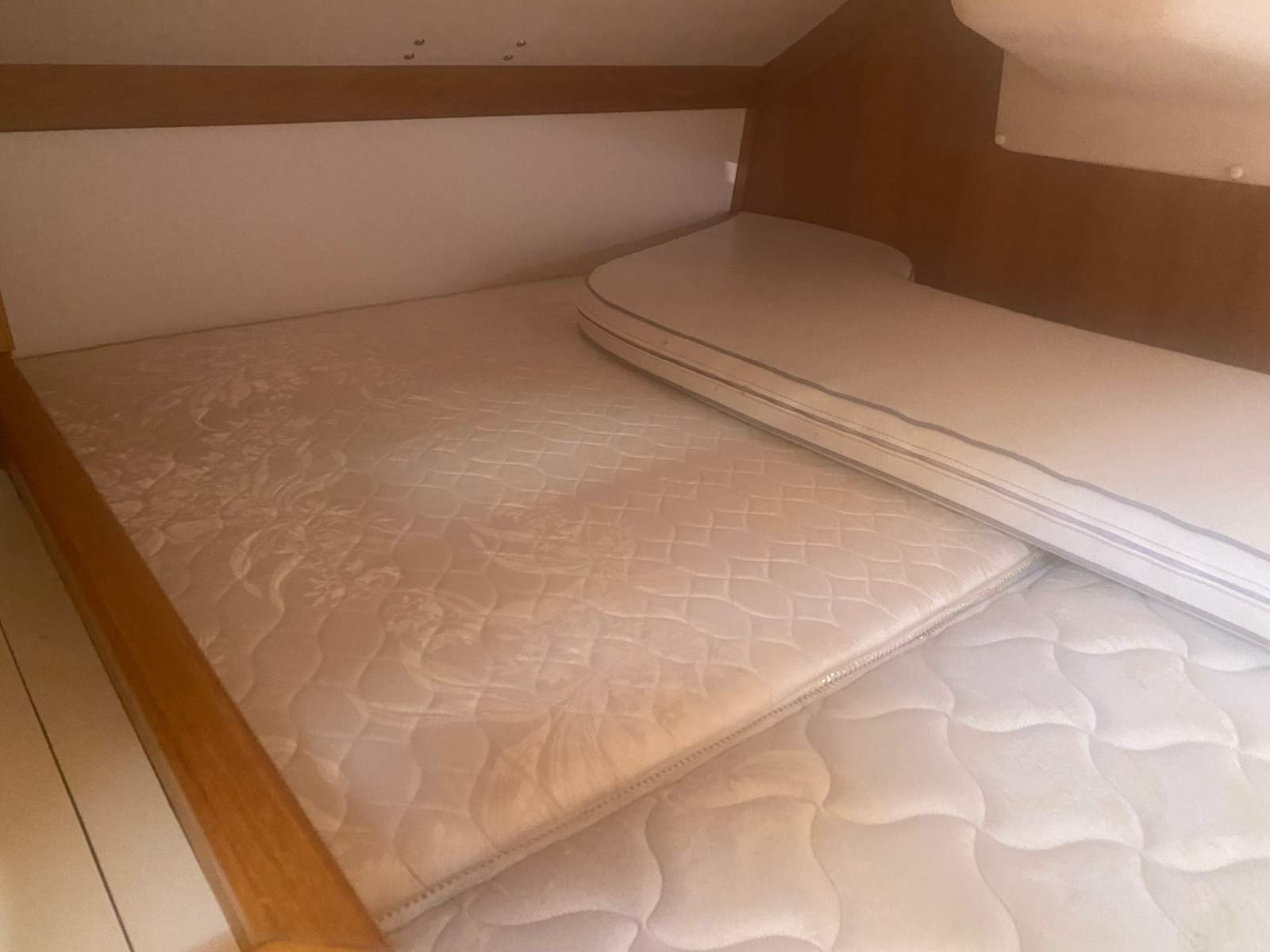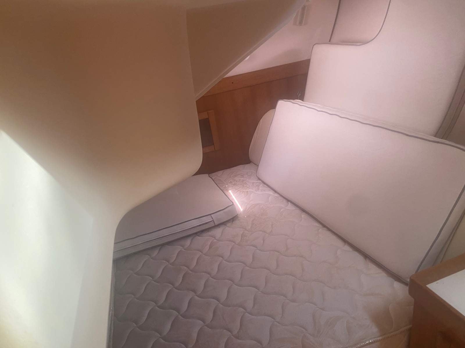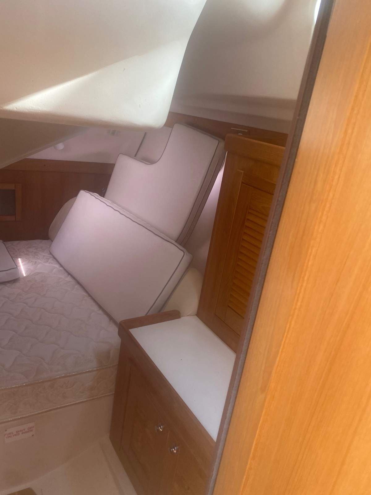 Island double v berth forward, head/shower to port, saloon berth near dinette to port, galley to stbd, nav stn to port, double cabin aft athwartships. Interior finished in quality teak with white ultraleather upholstery and inner spring mattresses.